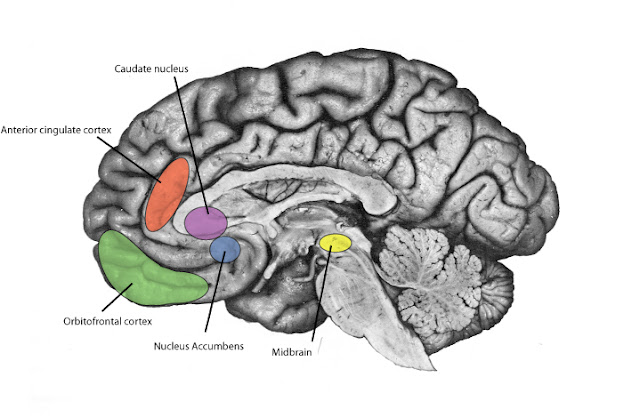Rewards lead to activation in certain regions of the brain: there are reward centres in the midbrain, nucleus accumbens, caudate nucleus, and orbitofrontal cortex. These areas are activated by pleasurable stimuli: good food, money, sex, rewarding exercise, and listening to music we enjoy, among many others. These types of pleasures lead to the release of endorphins and other endogenous opiates, which activate the reward circuitry of the brain. These natural brain chemicals are related to drugs such as morphine, which explains why narcotic drugs also activate the pleasure centres of the brain.